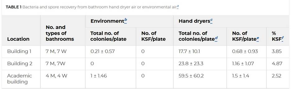 “Hot-air hand dryers in multiple men’s and women’s bathrooms in three basic science research areas in an academic health center were screened for their deposition on plates of (i) total bacteria …
